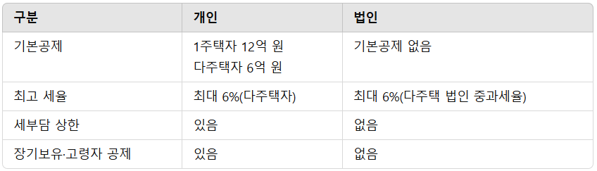 2️⃣ 개인과 법인의 종부세 차이 핵심 정리